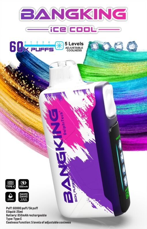 Bang King Ice Cool 60000|5 段可調冰感電子煙,內建網狀線圈、850mAh電池與Type-C快充。60,000口超長續航、12種果香冰爽口味,台灣現貨供應,享受極致冰感體驗。